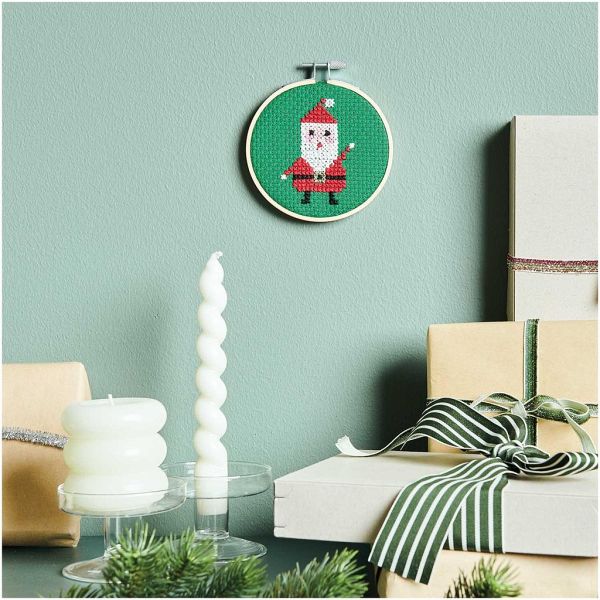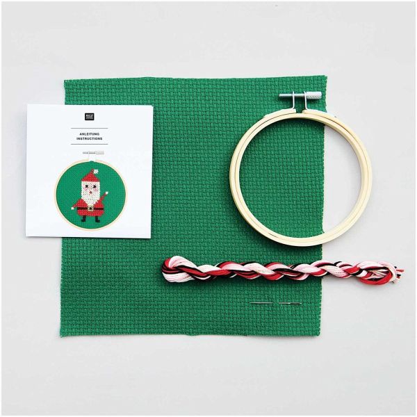 Die Stickpackung beinhaltet alle Materialien, die benötigt werden, um das perfekte Bild zu sticken: vom Stoffzuschnitt, dem Stickring, Stickgarn und der Sticknadel bis hin zur Anleitung. Der Stoffzuschnitt und das Stickgarn bestehen aus 100% Baumwolle. Das Bild zeigt einen Nikolaus auf grünem Grund. Mit dem verständlichen Zählmuster im Anleitungsteil lässt sich das Motiv ganz einfach nachsticken.