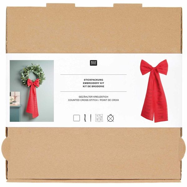 Die Stickpackung beinhaltet alle Materialien, die benötigt werden, um eine große Schleife zu entwerfen und zu besticken: vom Schleifenband, über das Stickgarn und der Sticknadel bis hin zur Anleitung. Das Stickgarn besteht aus 100% Baumwolle, das Band aus 100% Leinen. Die Schleife kann dank des verständlichen Zählmusters mit der Aufschrift "Fröhliche Weihnachten" verziert werden.