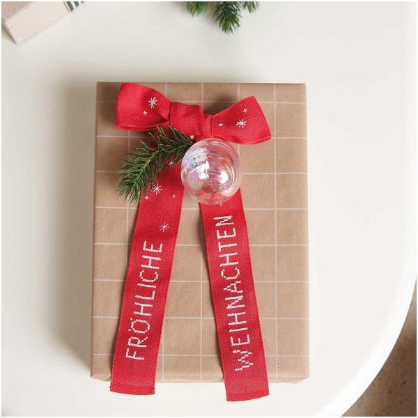 Stickpackung Schleife Fröhliche Weihnachten 16x31cm Mit der Schleifen-Stickpackung können Sie mühelos ein festliches Dekorationselement für die Weihnachtszeit kreieren! Die rote Schleife kann mit dem Schriftzug "Fröhliche Weihnachten" und vereinzelten Weihnachtssternen im gezählten Kreuzstich bestickt werden. Das Set beinhaltet dafür alle notwendigen Materialien: Leinenband, Stickgarn, Sticknadel und eine Anleitung mit Zählmuster.