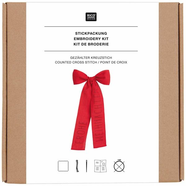 Die Stickpackung beinhaltet alle Materialien, die benötigt werden, um eine hübsche Schleife zu besticken: vom Schleifenband, über das Stickgarn und der Sticknadel bis hin zur Anleitung. Das Stickgarn besteht aus 100% Baumwolle, das Schleifenband aus Leinen. Die Schleife kann mithilfe des Zählmusters im Anleitungsteil mit der festlichen Aufschrift "Frohe Weihnachten" bestickt werden.