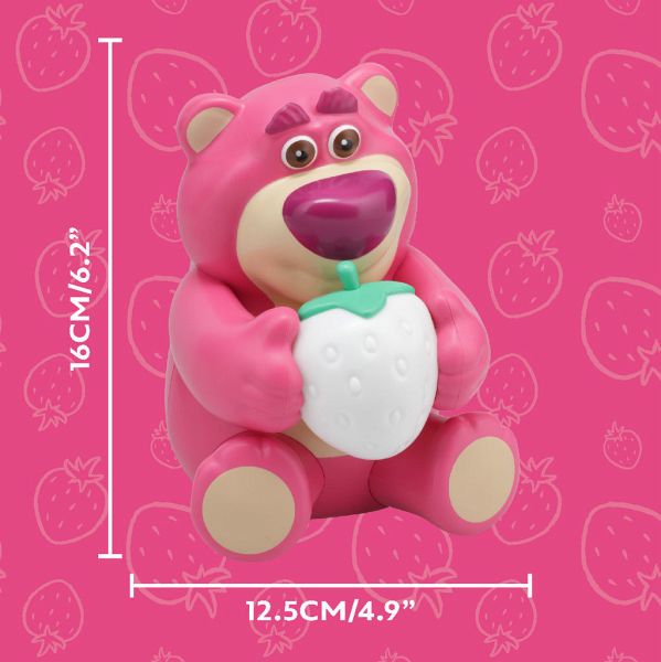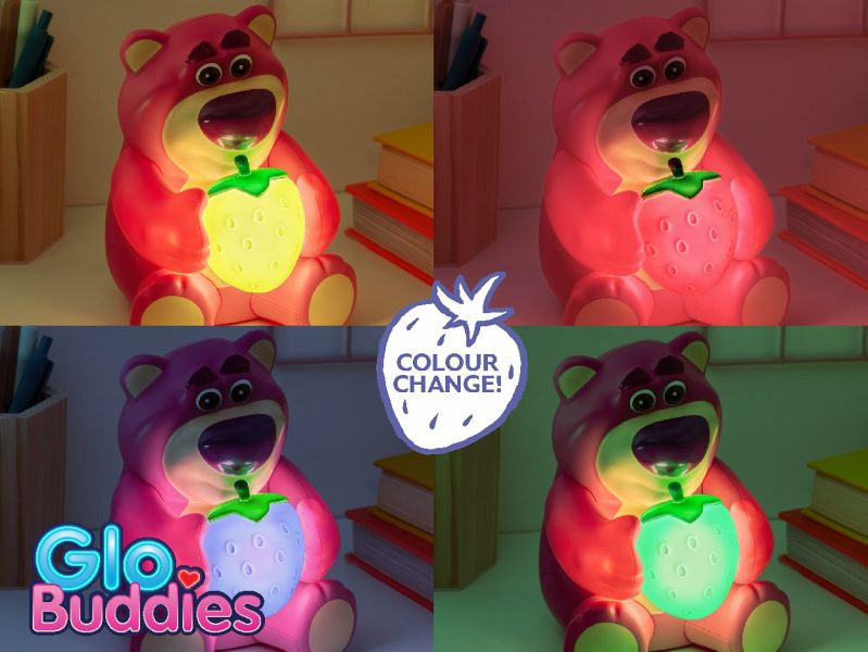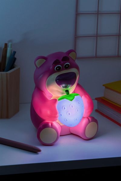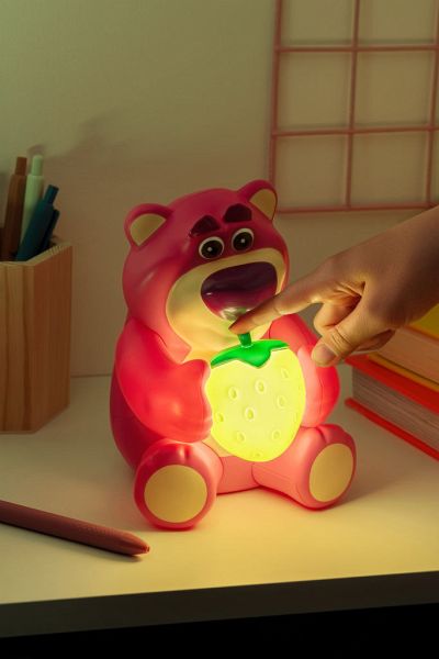 Die 16 cm große 3D-Figur hat die Form des Lots-o'-Huggin' Bear aus Toy Story. Die Erdbeere in seinen Armen leuchtet auf, wenn sie eingeschaltet wird, und bringt ein sanftes Licht in jeden Raum. Wähle zwischen Regenbogen-Phasenlicht oder wähle deine Lieblingsfarbe - drücke einfach auf den Stiel der Erdbeere, um deine Wahl zu treffen.