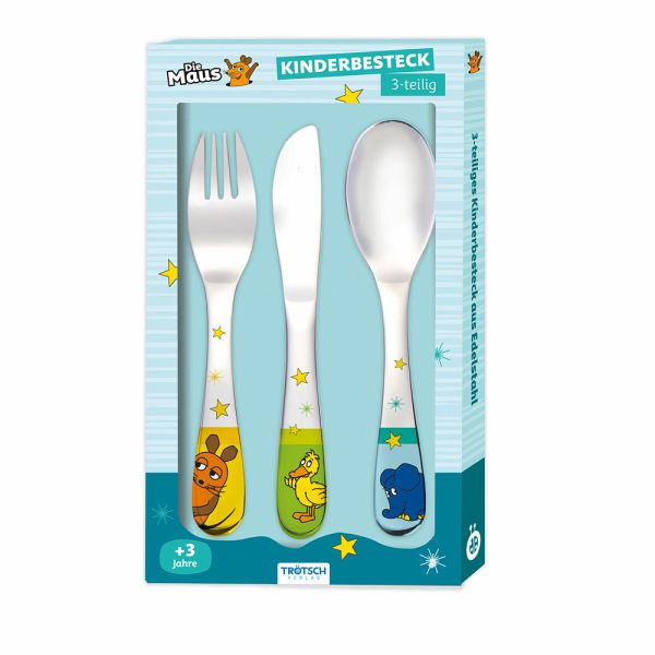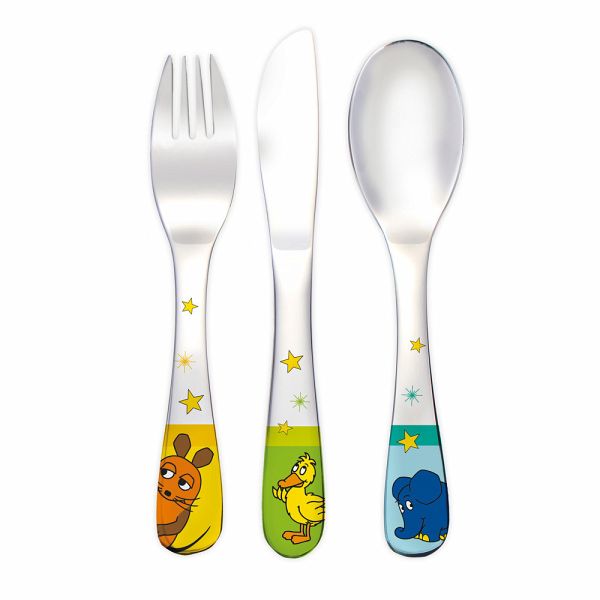 Das farbenfrohe 3-teilige Besteck-Set von der Maus macht jede Mahlzeit zu einem Vergnügen, und Kinder ab drei Jahren lernen gemeinsam mit der Maus, dem Elefanten und der Ente kindgerecht, mit Löffel, Gabel und Messer zu essen. Die breiten, abgerundeten Griffe liegen dabei sicher in der Hand. Robust und langlebig aus rostfreiem, hochwertigen Edelstahl.Handspülung empfohlen.