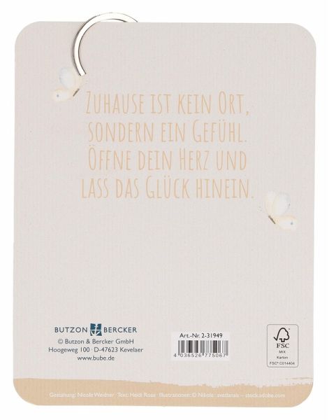 Ein liebevoller Begleiter für unterwegs: Der Schlüsselanhänger verbindet natürliche Materialien mit einer berührenden Botschaft.Der kleine Haus-Anhänger aus hochwertigem Eichenholz trägt eine feine Herz-Lasergravur und wird von einem grauen Lederband ergänzt - schlicht, stilvoll und voller Symbolkraft.Auf der Backcard findet sich ein inspirierender Spruch von Heidi Rose:Zuhause ist kein Ort, sondern ein Gefühl. Öffne dein Herz und lass das Glück hinein.Ob als kleines Geschenk, Zeichen der Verbundenheit oder täglicher Mutmacher - dieser Anhänger ist von Herzen gemacht.