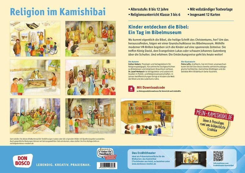 Wo hat die Bibel eigentlich ihren Ursprung? Wer hielt die vielen Überlieferungen fest und was wissen wir heute über die lange Geschichte der Heiligen Schrift des Christentums? In dieser lebensnahen Sachgeschichte für das Kamishibai folgen wir einer Grundschulklasse ins Bibelmuseum. Die Kinder begeben sich dort auf eine spannende Zeitreise. Mit Hilfe moderner VR-Brillen begegnen sie König David, treffen den Evangelisten Lukas oder schauen Johannes Gutenberg über die Schulter.