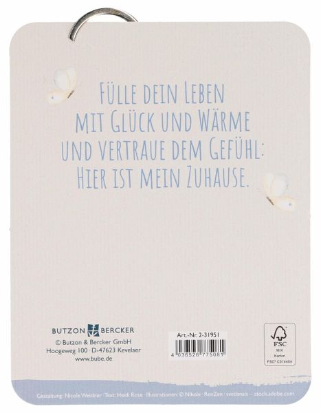 Ein liebevolles Stück Geborgenheit zum Mitnehmen: Der Schlüsselanhänger erinnert daran, dass Heimat dort ist, wo man sich geliebt und wohl fühlt.Gefertigt aus naturbelassenem Eichenholz und versehen mit einer feinen Herz-Lasergravur im Haus-Design, wird er mit einem grauen Lederband stilvoll ergänzt.Die Rückseite der Backcard trägt eine warme Botschaft von Heidi Rose:Fülle dein Leben mit Glück und Wärme und vertraue dem Gefühl: Hier ist mein Zuhause.Ein ideales Geschenk für Herzensmenschen - als Zeichen der Verbundenheit, als Einzugsgeschenk oder als kleiner Mutmacher für unterwegs.