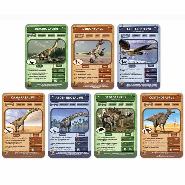 Ein fesselndes Fragespiel erwartet dich - deine Mission: Errate den Dinosaurier auf der Spielkarte! Du kannst bis zu zehn geschickte Fragen stellen, deine Überlegungen sorgfältig anstellen und deine Hinweiskarten taktisch nutzen, um der Erste zu sein, der sieben Spielkarten ergattert. Sei bereit für ein aufregendes Abenteuer in der Welt der Dinosaurier!