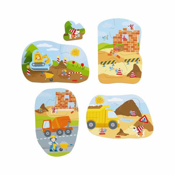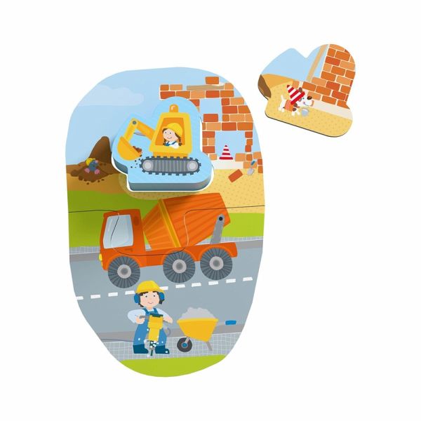 4 Puzzles plus Holzfigur Baustelle sind der perfekte Einstieg ins Puzzlevergnügen für Kinder ab 2 Jahren. Der kleine Hund Sammy besucht alle Baustellen und sorgt damit beim ersten Puzzeln für besonders viel Freude. Die 4 Motive enthalten 2 oder 3 unterschiedlich große Puzzleteile aus Pappe, die sich von kleinen Kinderhänden schön greifen lassen. Das Highlight: eine zauberhafte, beidseitig bedruckte Holzfigur, die in jede Puzzleszene integriert werden kann! Du darfst entscheiden, wer heute auf der Baustelle baggert: Max oder Mia? Der Fantasie sind keine Grenzen gesetzt! So fördern die Puzzles spielerisch die Feinmotorik kleiner Puzzlefans.