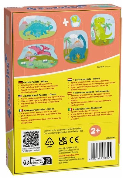 4 Puzzles plus Holzfigur Dinos sind der perfekte Einstieg ins Puzzlevergnügen für Kinder ab 2 Jahren. Wunderschön illustrierte Dino-Motive sorgen beim ersten Puzzeln für besonders viel Freude. Die 4 Motive enthalten 2 oder 3 unterschiedlich große Puzzleteile aus Pappe, die sich von kleinen Kinderhänden schön greifen lassen. Das Highlight: eine zauberhafte, beidseitig bedruckte Holzfigur, die in jede Puzzleszene integriert werden kann! Kaum aus dem Ei geschlüpft, macht sich der kleine Dino auch schon mutig auf den Weg zu seinen Freunden. Der Fantasie sind keine Grenzen gesetzt! So fördern die Puzzles spielerisch die Feinmotorik kleiner Puzzle-Fans.