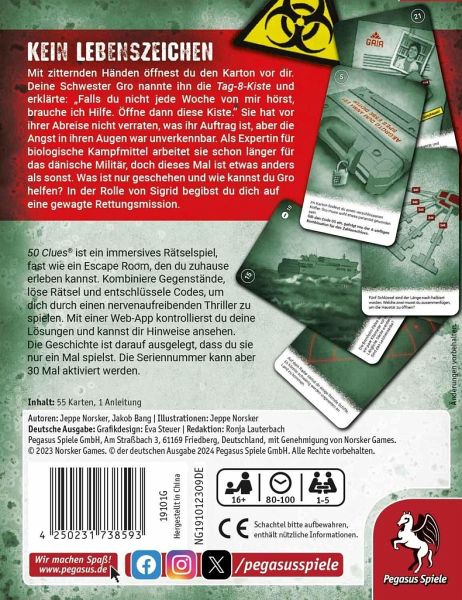 Die 50 Clues-Reihe bietet einen immersiven Rätsel-Thriller für zuhause. Gemeinsam müssen die Spielenden einen Fall lösen, indem sie Gegenstände kombinieren, Rätsel lösen und Codes entschlüsseln. Mithilfe einer Web-App können sie ihre Lösungen kontrollieren und falls nötig Hinweise erhalten. Jeder Teil kann dabei eigenständig gespielt werden, zusammen erzählen Kein Lebenszeichen, Tiefer hinab und Die letzte Reise aber einen zusammenhängenden Thriller: Sigrids Suche. Die Geschichte ist dabei zwar darauf ausgelegt, dass sie nur ein Mal gespielt wird, aber die Seriennummer kann in der App bis zu 30 Mal aktiviert werden. In 50 Clues Kein Lebenszeichen erleben die Spielenden den ersten Teil der Geschichte: Mit zitternden Händen öffnest du den Karton vor dir. Deine Schwester Gro nannte ihn die Tag-8-Kiste und erklärte: Falls du nicht jede Woche von mir hörst, brauche ich Hilfe. Öffne dann diese Kiste. Sie hat vor ihrer Abreise nicht verraten, was ihr Auftrag ist, aber die Angst in ihren Augen war unverkennbar. Als Expertin für biologische Kampfmittel arbeitet sie schon länger für das dänische Militär, doch dieses Mal ist etwas anders als sonst. Was ist nur geschehen und wie kannst du Gro helfen? In der Rolle von Sigrid begibst du dich auf eine gewagte Rettungsmission.