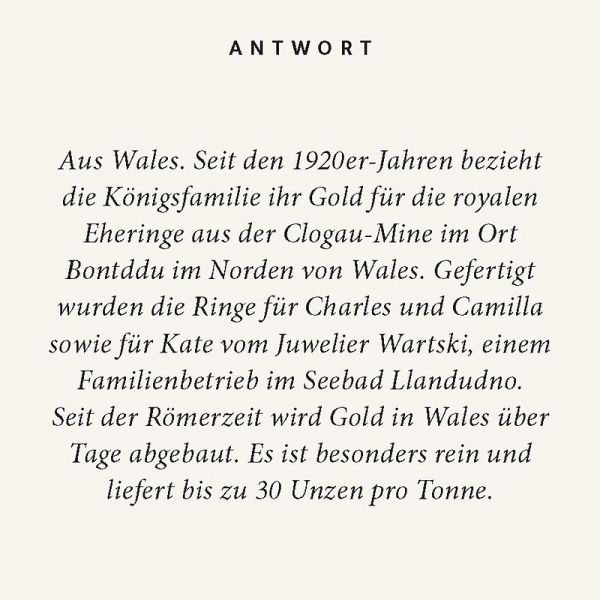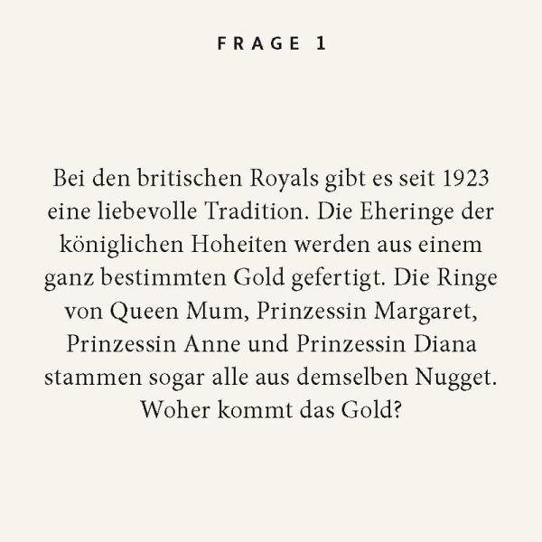 Glamouröse Prachtentfaltung, jahrhundertealtes Zeremoniell, edle Roben, Juwelen und Karossen, garniert mit handfesten Skandalen, Affären und Intrigen - das Leben der Royals setzt allem die Krone auf! Und was ist faszinierender als das Palastgeflüster rund um Dirty Harry, Prins Pilsje oder die traurigste Fürstin der Welt? Dies lässt sich wunderbar verspielt erkunden in 100 aristokratischen Fragen und Antworten, die garantiert für königliche Unterhaltung sorgen.Stilvoll, elegant und immer eine gute Idee: Die Reihe "Quiz im Quadrat" präsentiert sich in modernem Design und sorgt für unterhaltsamen Rätselspaß - verpackt in einer edlen Geschenkbox. Perfekt als besondere 'Grußkarte' mit Mehrwert - zum Verschenken oder Selberfreuen!