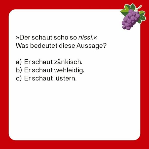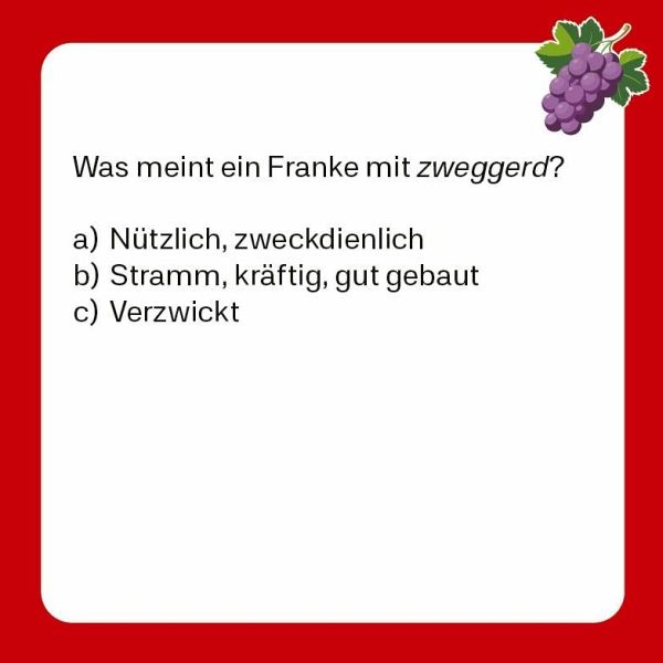 Allmächd – Fränkisches Dialekt-Quiz- Lustiges Fränkisch-Quiz mit 66 Fragen Mit dem originellen Dialekt-Quiz „Allmächd" tauchst du ein in die skurrile, charmante und oft urkomische Welt der fränkischen Sprache. Ob du aus Mittelfranken, Oberfranken oder Unterfranken kommst – oder einfach Spaß an deutschen Dialekten hast: Dieses Franken-Quiz bringt garantiert Stimmung in jede Runde. 66 Quizkarten mit witzigen Dialekt-Fragen und Anleitung Was ist ein »Dibferlasscheißer«? Was treibt eine »Hullewaatsch«? Und was bitte meint jemand mit »I ho a ä ü«? Bei jeder der 66 Fragen stehen drei Antwortmöglichkeiten zur Wahl – perfekt für alle, die gerne rätseln, lachen oder ihr Fränkisch-Wissen testen möchten. Ideal als Partyspiel, Geschenk oder Reisespiel Egal ob beim Spieleabend, im Urlaub in Franken, auf dem Dorffest oder als humorvolles Geschenk für Dialekt-Fans – dieses Fränkisch-Quiz passt immer. Auch für Sprachliebhaber und Heimatfreunde ein echtes Schmankerl. Tipp: Wer danach noch mehr will, greift zum Quizspiel „Gräschkurs Fränkisch"!