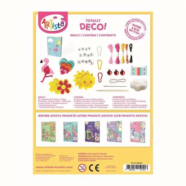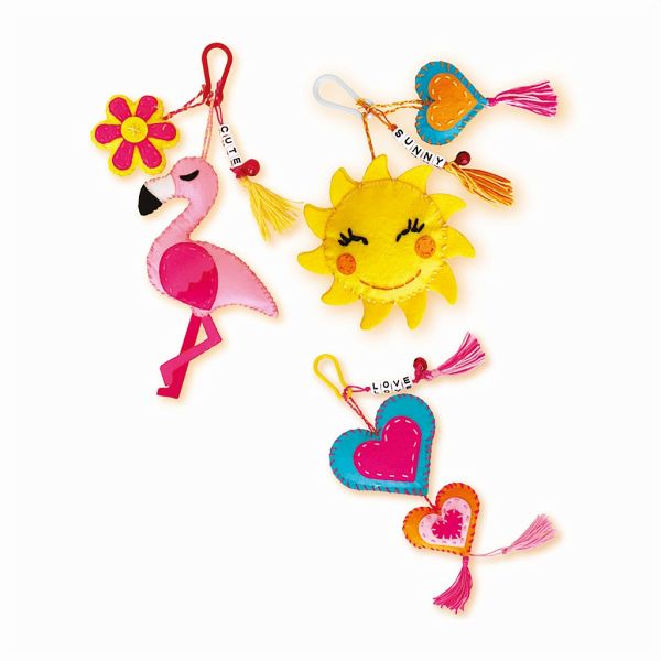 Mit diesem Nähset basteln Kinder ab 8 Jahren ihre eigenen Anhänger für den Schulrucksack, Schlüssel und mehr. In dem Set ist alles, um die 27 Filzstücke zusammenzunähen, zu stopfen und weiter individuell mit verschiedenen Dekoelementen wie Buchstaben-Perlen oder Glöckchen zu ergänzen. Mit den enthaltenen Karabinern können die fertigen Kunstwerke wie Herzen, Flamingo oder Sonnen ganz einfach überall angebracht werden.