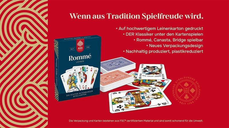 ASS Altenburger ist das älteste bekannte Unternehmen in der Entwicklung und Produktion von Spielkarten in ganz Europa. Ganz nach dem Motto: Ein Herz für Kartenspiele - seit 1765. Wir entwickeln und optimieren unsere Produkte und Produktionsprozesse stetig weiter. Umweltschonend zu handeln ist dabei ein wichtiger Aspekt. Wir legen seit Langem großen Wert auf nachhaltige Produkte und Plastikreduzierung. Daher kommt das neue Rommé komplett ohne Plastik im Spiel aus. Die Karten tragen das echte ASS Altenburger Kartenbild und sind statt in Plastik, mit Papier eingeschlagen. Die Verpackung sowie die Karten bestehen aus FSC®-zertifiziertem Material und sind besonders schonend für die Umwelt. Begleitet wird das neue Rommé mit einem Re-Design der Marke. Der neue Markenauftritt kommt modern und zeitlos daher. Das Design rückt die langjährige ASS Altenburger Tradition in der Vordergrund und das neue Design wirkt gleichzeitig edlel und hochwertig.