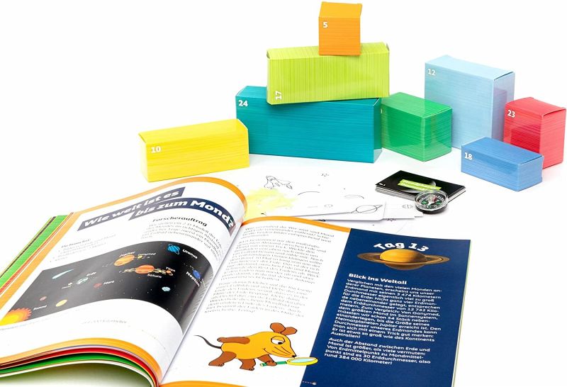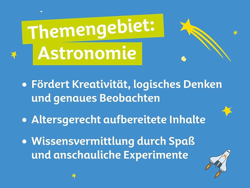 Kinder ab 7 Jahren freuen sich über dieses bunte und pralle Spaß- und Wissenspaket. Die Inhalte der 24 Boxen aus umweltfreundlicher Kartonage erklären z.B. Sternbilder, wie ein Planetarium funktioniert, wie man sich selbst einen Mondkrater basteln kann und vieles mehr. Ein ausführliches, reich bebildertes Begleitbuch führt sicher durch die Experimente und sorgt für Erfolgserlebnisse.