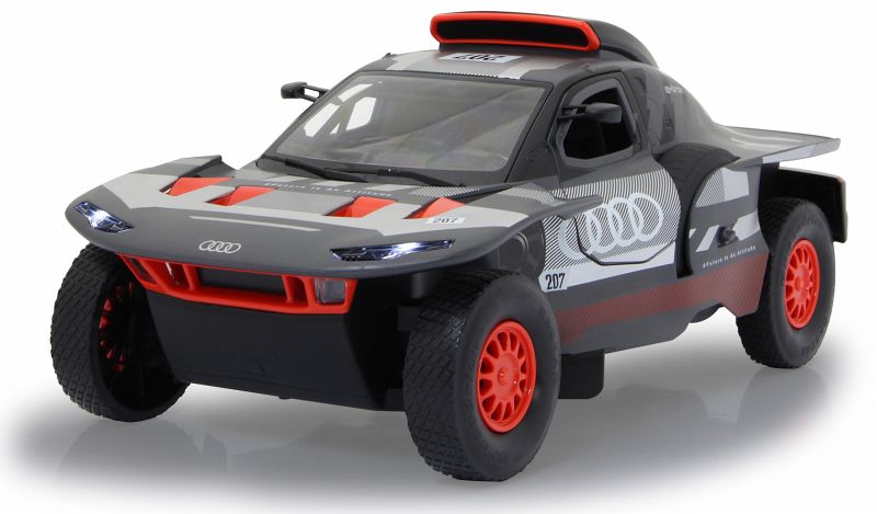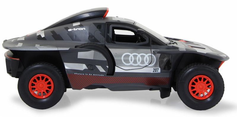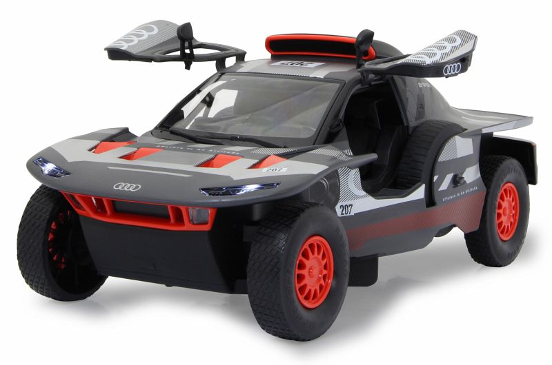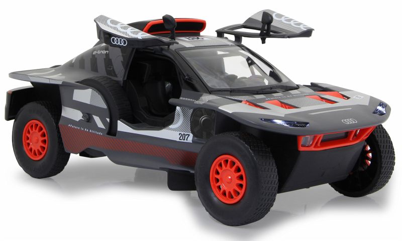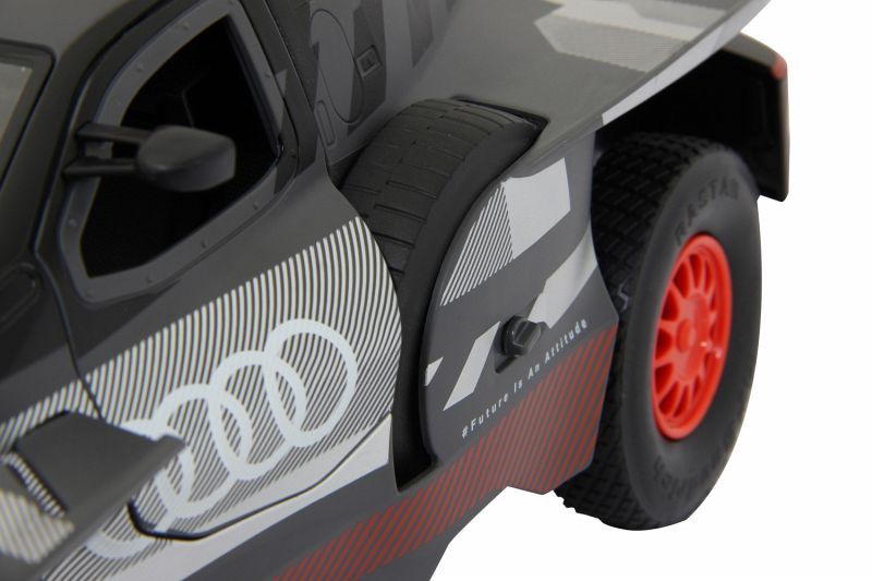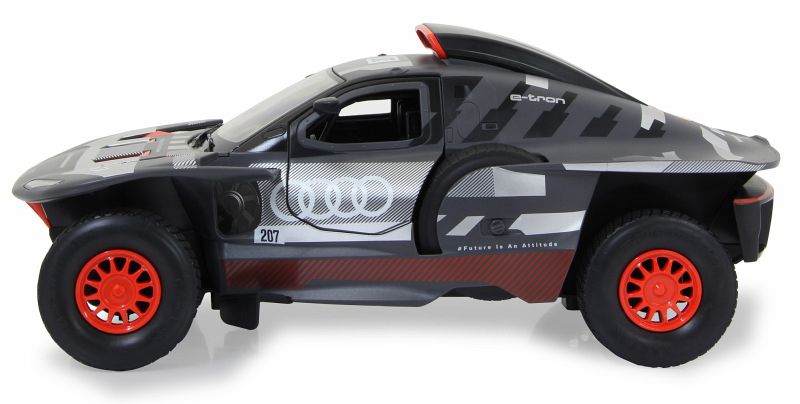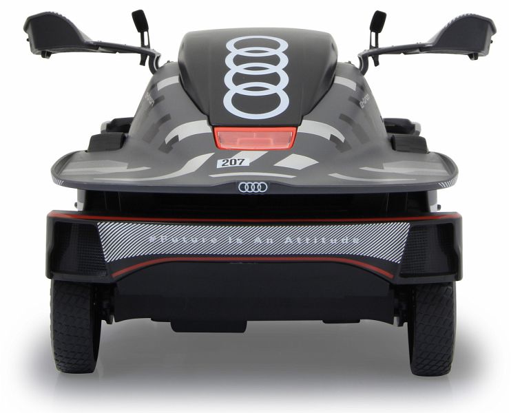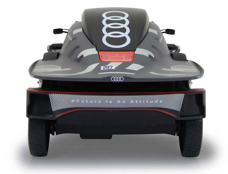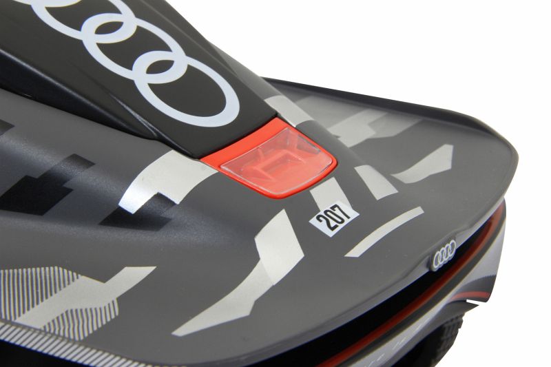 Der Audi RS Q e-tron E2 ist im Original ein speziell für Marathon-Rallyes entwickelter Geländewagen der Prototypen-Klasse von Audi Sport und ist seit 2022 bei der Rallye Dakar im Einsatz. Der RS Q e-tron trägt das Kürzel E2 und erinnert damit an den legendären Audi Sport quattro in seiner endgültigen Ausbaustufe für die Rallye-Gruppe B in den Achtzigerjahren. Der e-tron ist überwiegend in matt schwarz lackiert. Auf der gesamten Karosserie finden sich weitere Akzente im typischen Audi Sport Design. Der Traum so einen Wagen selber zu fahren kann jetzt wahr werden. Mit diesem offiziell lizensierten Deluxe Car Modell 1:14 von JAMARA können Sie sich das Gefühl so ein Rallyewagen zu besitzen ins heimische Wohnzimmer holen. Mit perfekt nachgebildeten originalen Details an Chassis und Karosserie die mit viel Liebe umgesetzt wurde, überzeugt das Fahrzeug zusätzlich durch die hochwertige Verarbeitung. Mit der ergonomischen 2,4 GHz Fernsteuerung halten Sie, wie in einem echten Sportwagen, die Schaltzentrale in der Hand und erreichen Geschwindigkeiten bis zu 11 Km/h. Leicht zu erlernende Kommandos lassen das Modell mit seinen 33cm Länge, genau das tun was Sie vorgeben. Also, ab zur Rallyerunde auf dem Parkett im Kinderzimmer und dem Spielspaß steht nichts mehr im Wege. Originalgetreue Lackierung Alle Deluxe Car Modelle von JAMARA sind Roboterlackiert. Dieses Verfahren ist einmalig bei den lizensierten Fahrzeugen. Statt einem einfachen eingefärbten Kunststoff kommen bei diesem Lackierverfahren Farben zum Einsatz die dem originalen Farbton des Fahrzeugherstellers nachempfunden wurden. Detailgetreuer Innenraum Bei den lizensierten Fahrzeugen im Maßstab 1:14 gibt es neben der originalgetreuen Fahrzeugbauform auch einen dem Original nachempfundenen Innenraum. Mit Lenkrad, Armaturenbrett, und Ausstattungsmerkmalen wie beim echten Automobil dieser Marke. Bis ins kleineste Detail wurde hier auf alles geachtet und umgesetzt. LED Fahrlicht Wie bei einem echten Fahrzeug in derSpezialausstattung gibt es bei diesem Modell ein Start-Stop LED Fahrlicht. Sobald das Modell losfährt leuchten die Scheinwerfer hell auf. Wenn das Auto stoppt gehen die LED Fahrlichter wieder aus. Diese Funktion spart Energie und erhöht die Fahrzeit des Modelles. Türen manuell öffnen/schließen Bei diesem Modell können die Türen auf beiden Seiten von Hand geöffnet werden. Einfach durch die Fensteröffnung greifen und schon kann man mit leichtem ziehen die Türen öffnen und genauso wieder geschlossen werden. Driftfunktion Mit Vollgas in die Kurve und das Heck bricht aus und driftet wie bei einem Rennwagen. Mit der Driftfunktion die über die Fernsteuerung kontrolliert ausgelöst werden kann ist das bei diesem Modell kein Problem. Ein Knopfdruck und der Wagen beschleunigt so, dass das Modell um die Kurven driften kann.