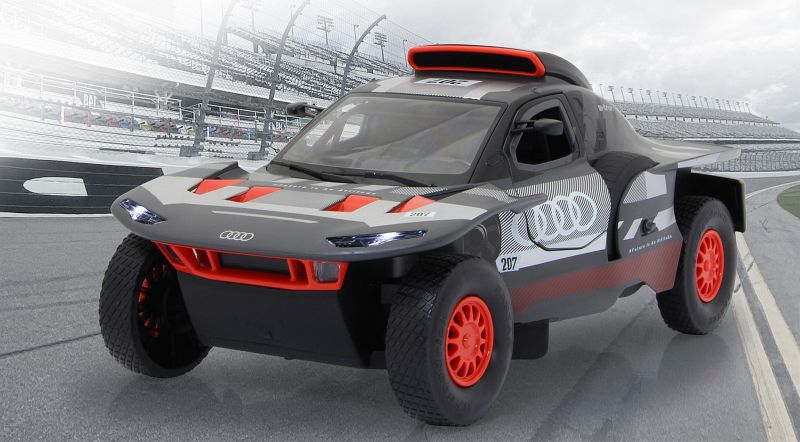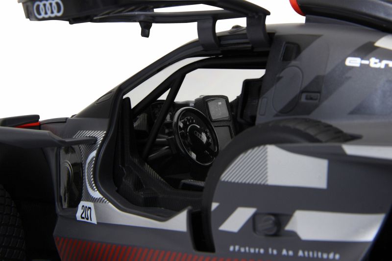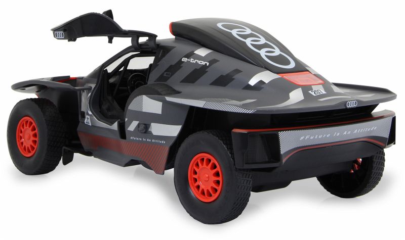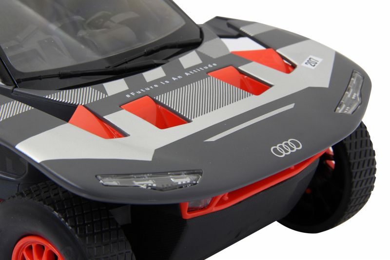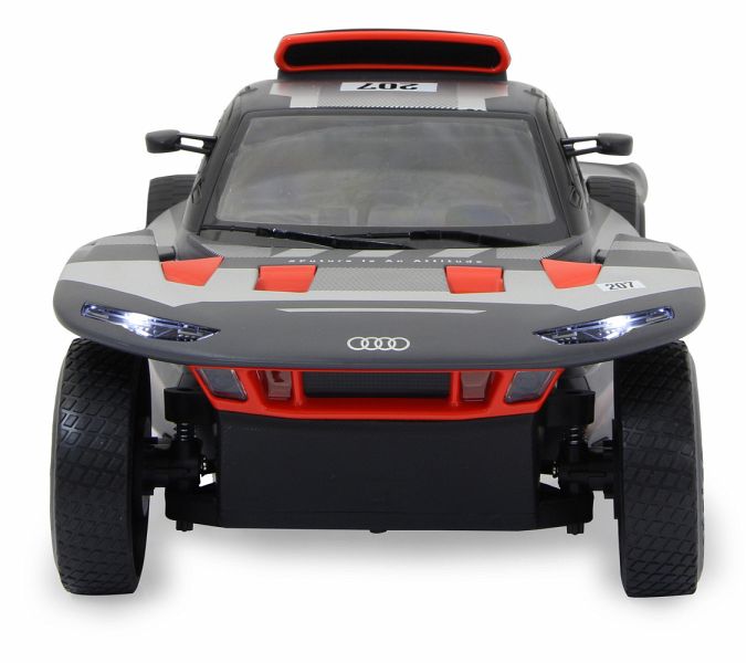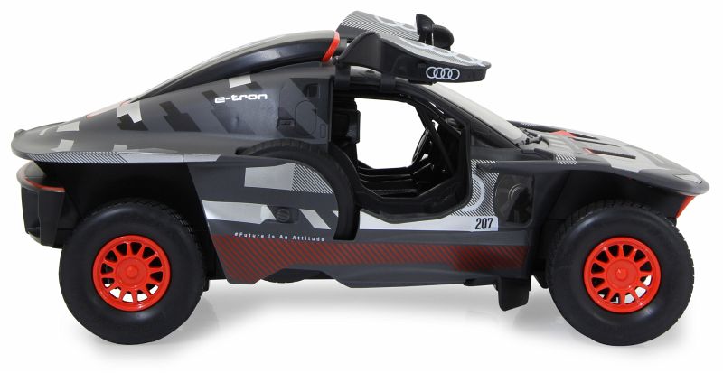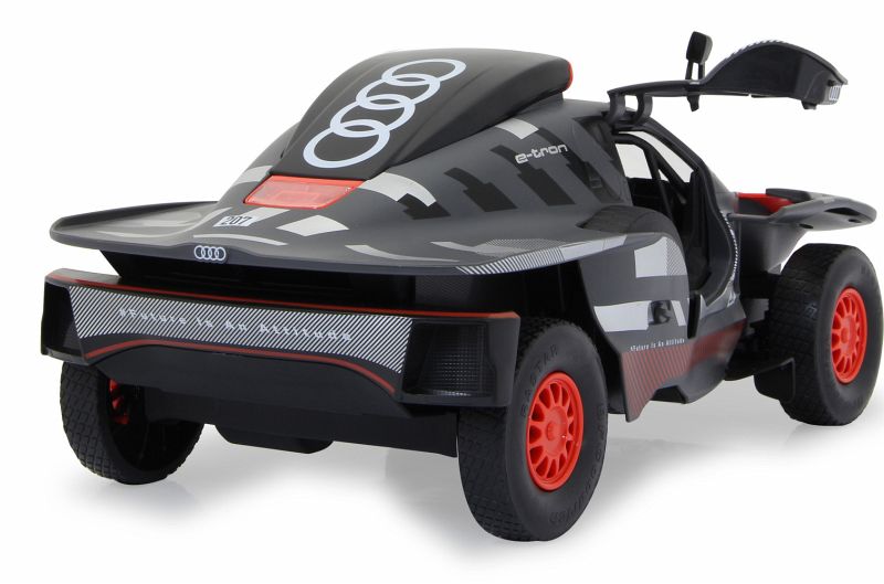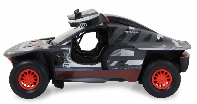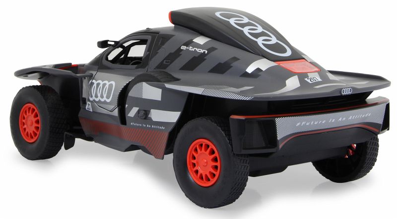 Der Audi RS Q e-tron E2 ist im Original ein speziell für Marathon-Rallyes entwickelter Geländewagen der Prototypen-Klasse von Audi Sport und ist seit 2022 bei der Rallye Dakar im Einsatz. Der RS Q e-tron trägt das Kürzel E2 und erinnert damit an den legendären Audi Sport quattro in seiner endgültigen Ausbaustufe für die Rallye-Gruppe B in den Achtzigerjahren. Der e-tron ist überwiegend in matt schwarz lackiert. Auf der gesamten Karosserie finden sich weitere Akzente im typischen Audi Sport Design. Der Traum so einen Wagen selber zu fahren kann jetzt wahr werden. Mit diesem offiziell lizensierten Deluxe Car Modell 1:14 von JAMARA können Sie sich das Gefühl so ein Rallyewagen zu besitzen ins heimische Wohnzimmer holen. Mit perfekt nachgebildeten originalen Details an Chassis und Karosserie die mit viel Liebe umgesetzt wurde, überzeugt das Fahrzeug zusätzlich durch die hochwertige Verarbeitung. Mit der ergonomischen 2,4 GHz Fernsteuerung halten Sie, wie in einem echten Sportwagen, die Schaltzentrale in der Hand und erreichen Geschwindigkeiten bis zu 11 Km/h. Leicht zu erlernende Kommandos lassen das Modell mit seinen 33cm Länge, genau das tun was Sie vorgeben. Also, ab zur Rallyerunde auf dem Parkett im Kinderzimmer und dem Spielspaß steht nichts mehr im Wege. Originalgetreue Lackierung Alle Deluxe Car Modelle von JAMARA sind Roboterlackiert. Dieses Verfahren ist einmalig bei den lizensierten Fahrzeugen. Statt einem einfachen eingefärbten Kunststoff kommen bei diesem Lackierverfahren Farben zum Einsatz die dem originalen Farbton des Fahrzeugherstellers nachempfunden wurden. Detailgetreuer Innenraum Bei den lizensierten Fahrzeugen im Maßstab 1:14 gibt es neben der originalgetreuen Fahrzeugbauform auch einen dem Original nachempfundenen Innenraum. Mit Lenkrad, Armaturenbrett, und Ausstattungsmerkmalen wie beim echten Automobil dieser Marke. Bis ins kleineste Detail wurde hier auf alles geachtet und umgesetzt. LED Fahrlicht Wie bei einem echten Fahrzeug in derSpezialausstattung gibt es bei diesem Modell ein Start-Stop LED Fahrlicht. Sobald das Modell losfährt leuchten die Scheinwerfer hell auf. Wenn das Auto stoppt gehen die LED Fahrlichter wieder aus. Diese Funktion spart Energie und erhöht die Fahrzeit des Modelles. Türen manuell öffnen/schließen Bei diesem Modell können die Türen auf beiden Seiten von Hand geöffnet werden. Einfach durch die Fensteröffnung greifen und schon kann man mit leichtem ziehen die Türen öffnen und genauso wieder geschlossen werden. Driftfunktion Mit Vollgas in die Kurve und das Heck bricht aus und driftet wie bei einem Rennwagen. Mit der Driftfunktion die über die Fernsteuerung kontrolliert ausgelöst werden kann ist das bei diesem Modell kein Problem. Ein Knopfdruck und der Wagen beschleunigt so, dass das Modell um die Kurven driften kann.