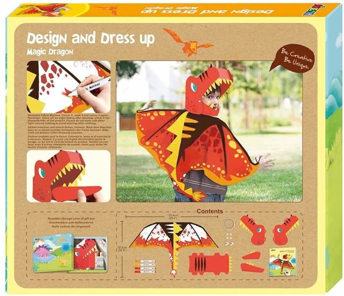 Gestalte dein eigenes Drachenkostüm. Aus diesem Set kann man einen Drachenkopf und ein Cape basteln.