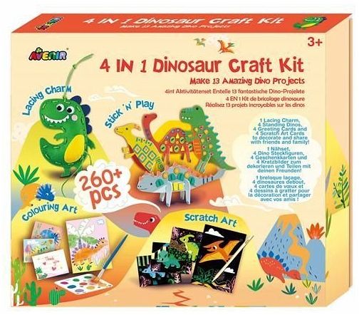 Dieses Kreativset enthält 4 verschiedene Bastelaktivitäten zum Thema Dinosaurier. Das Set ist auch für Anfänger wunderbar geeignet. Es umfasst 1 Schlüsselanhänger Nähset, 1 Fadenkunstbild, 3 Geschenkkarten und 4 Kratzbilder.