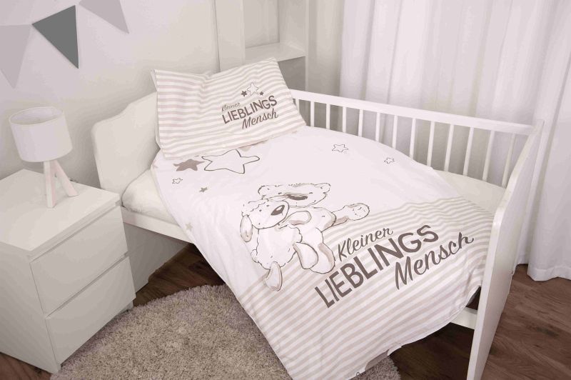 Die weiche babybest® Wendebettwäsche aus 100 % Baumwolle, Flanell ist nach STANDARD 100 by OEKO-TEX® zertifiziert und somit auf die zarten Ansprüche sensibler Babyhaut abgestimmt. Das süße Lieblingsmensch Design macht die bequeme Bettwäsche zu einem echten Blickfang in jedem Kinderzimmer und zum idealen Geschenk. Dank der kompakten Größe ist die Kleinkinderbettwäsche ideal verwendbar in Reise-, Gitter- und Juniorbetten oder dem ersten großen Bett. Unsere Heimtextilien schenken vom ersten Tag an kuschelige Geborgenheit. babybest® steht für nachhaltige Qualität, Verantwortung und Erfahrung. Das liebevoll gestaltete Sortiment von babybest® umfasst verschiedenste Artikel, die unseren Babys Sicherheit und Geborgenheit für einen erholsamen, gesunden Schlaf schenken. Überzeugen Sie sich selbst!