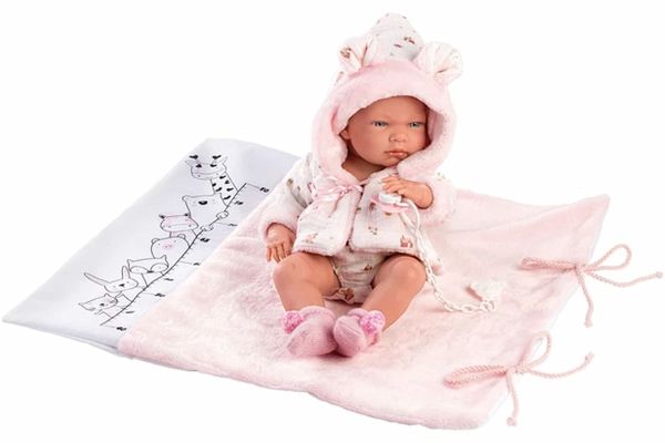 40cm große New Born Badepuppe mit blauen Augen und Geschlechtsmerkmal (Mädchen), komplett aus zartem Vinyl. Trägt einen rosa-weißen Bademantel inklusive Decke, Schnuller, Schnullerkette.