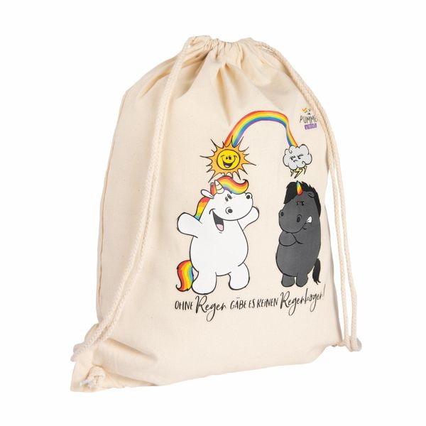 PUMMELEINHORN STOFFRUCKSACK: Der Stoffrucksack mit niedlichem Pummel & Friends Aufdruck und dem Spruch "Ohne Regen gäbe es keinen Regenbogen!" ist ein praktischer Beutel - nicht nur für Fans des süßen Einhorns.
