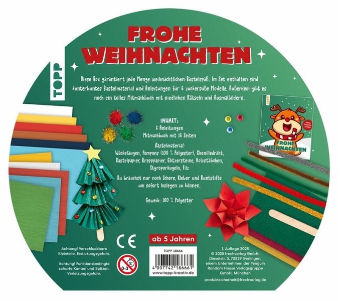 Einfach zum Verlieben! Diese Bastelbox bringt die Augen an Weihnachten zum Leuchten. Mit bunten Bastelmaterialien und kreativen Anleitungen entstehen sechs zuckersüße Bastelprojekte - perfekt zum Dekorieren, Verschenken oder Spielen. Das Mitmachbuch sorgt mit lustigen Rätseln und Ausmalbildern für noch mehr weihnachtlichen Spaß. Dein Rundum-Set für kreative Weihnachtsmomente!