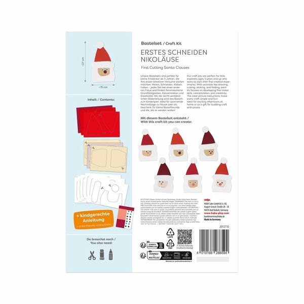 Schere, Kleber und schon sind die Nikoläuse fertig! Mit sechs fröhlichen Nikolausmotiven bietet das Set eine schöne Weihnachtsdeko für Fenster oder Tisch. Schritt für Schritt werden einfache Formen ausgeschnitten, wodurch Kinder spielerisch das Schneiden lernen und den sicheren Umgang mit der Kinderschere trainieren. Danach werden die Weihnachtsmänner zusammengeklebt und liebevoll verziert so entstehen kreative Bastelprojekte, die perfekt in die Adventszeit passen!