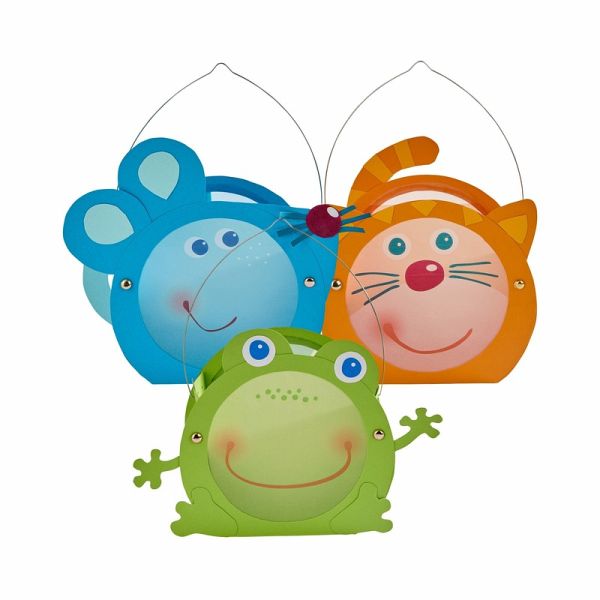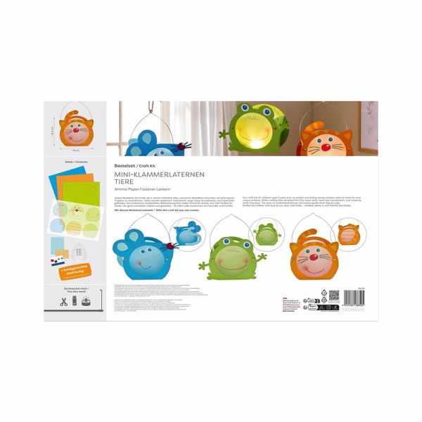Niedliche Tierlaternen zum Selbermachen! Dieses Bastelset enthält alles für drei tierisch süße Mini-Klammerlaternen ideal für den Laternenumzug. Die Laternenkörper werden einfach gefaltet und mit Klammern fixiert, ganz ohne Klebstoff oder lange Trocknungszeit. Anschließend mit Transparentpapier hinterkleben, tierische Formen ausschneiden und aufkleben. Zum Schluss ein elektrisches Teelicht einsetzen und schon leuchten die Mini-Laternen stimmungsvoll im Dunkeln. Perfekt für kreative Bastelstunden!