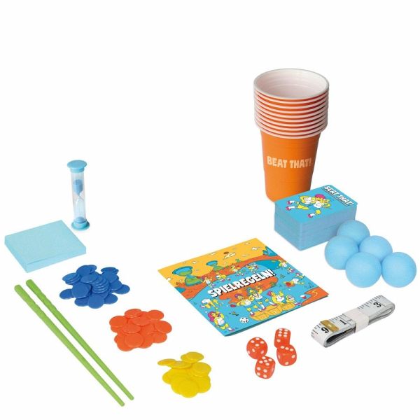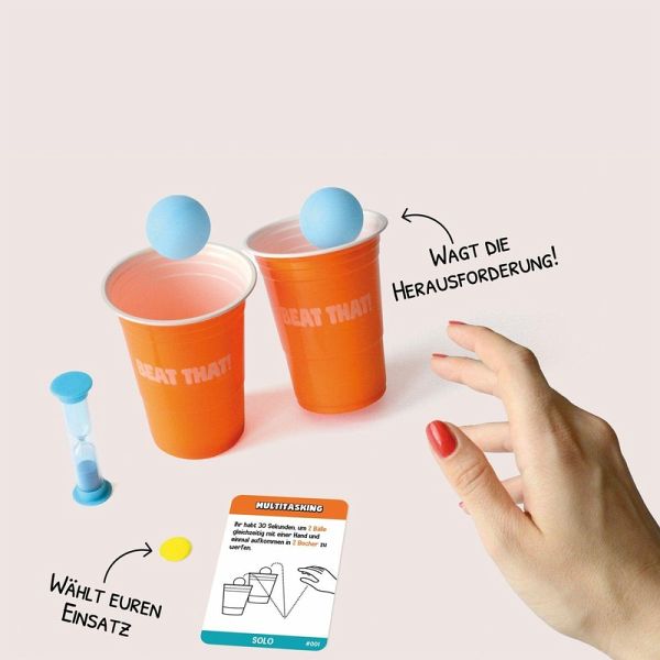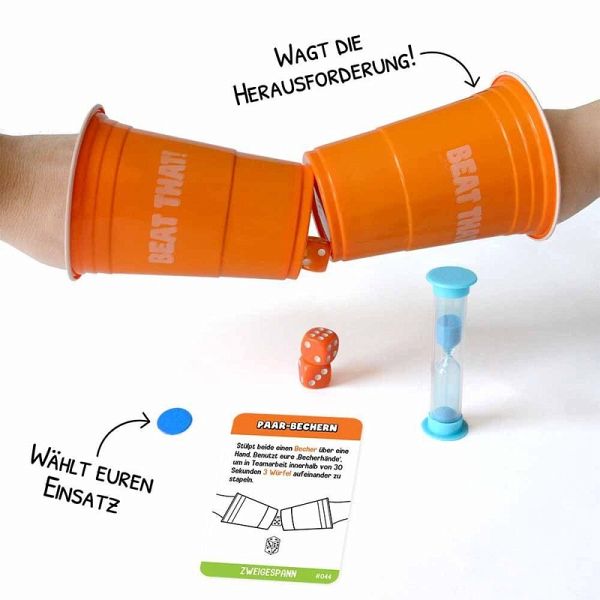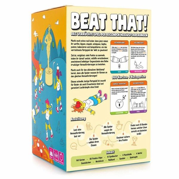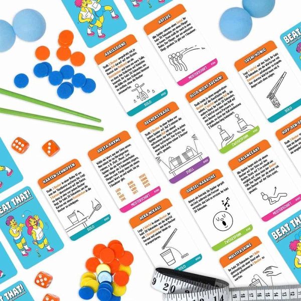 Das verrückte Spiel der rasenden Herausforderungen! Macht euch schon mal locker, denn jetzt müsst ihr werfen, kippen, stapeln, schnipsen, hüpfen, pusten, balancieren und katapultieren, um das verrückteste Partyspiel der Welt zu gewinnen! Ziel ist, möglichst viele Punkte zu sammeln, indem ihr darauf wettet, mithilfe verschiedener, anscheinend beliebiger Gegenstände eine Reihe irrwitziger Herausforderungen zu bestehen. Macht euch für den ultimativen Wettkampf bereit, denn alle Spieler messen ihr Können an den gleichen Herausforderungen! Dieses schnelle, lustige Partyspiel ist sowohl für Kinder als auch Erwachsene ideal und garantiert Lachkrämpe ohne Ende!