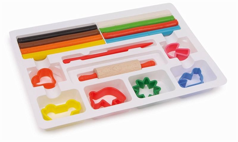Bunte Knetmassen (8 Rollen je 12 x 1,3 cm) und das Zubehör zum Ausrollen, Zuschneiden und 6 verschiedene Stechformen, helfen Kinderhänden beim Gestalten und der Schulung der Motorik durch tolle neue Fühlerlebnisse!