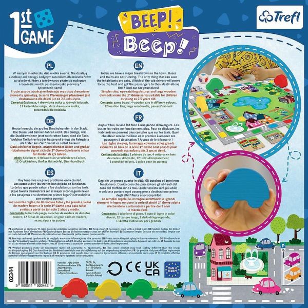 Beep! Beep! ist ein Brettspiel für Kleinkinder, in dem du in die Rolle eines Taxifahrers schlüpfst und deine Autos zu 3 gezogenen Zielen bringen musst. Du wirfst einen großen Holzwürfel und bewegst dich auf dem bunten Stadtplan, um deine Ziele zu erreichen. Wohin werden Ihre Kunden heute gehen wollen? Zum Park, zur Schule, zur Wohnsiedlung oder vielleicht zur Bushaltestelle? Welcher Taxifahrer wird der beste sein und seine Fahrgäste als erster an ihr Ziel bringen? Beep! Beep! ist ein großer Spaß für die ganze Familie! Das Spiel regt das räumliche Vorstellungsvermögen an und schult den gesunden Wettbewerb. Während des Spiels trainieren die Kinder ihr Gedächtnis, ihre Konzentration und ihre Geschicklichkeit und schulen ihr logisches Denken. ERSTE PLATTE SPIEL ist eine Spieleserie, die speziell für die jüngsten Kinder ab 2,5 Jahren entwickelt wurde. Die ersten Lebensjahre eines Kindes sind eine sehr dynamische Entwicklungsphase, ideal für den Einstieg in ein Abenteuer mit Brettspielen, die die kognitive Entwicklung des Kindes unterstützen. Die Serie umfasst Spiele, die an die Interessen, das Alter und die Bedürfnisse von Kleinkindern angepasst sind. Die farbenfrohen Illustrationen, die von anerkannten Kinderbuchautoren stammen, regen die kleinen Spieler zum Spielen an. Wir sorgen auch für die Sicherheit Ihrer Kleinen - die Spiele bestehen aus großen Holzelementen, und die Spielbretter und Spielsteine sind aus dickem und haltbarem Karton.