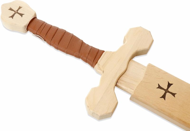 In den Schwertknauf und auf die Holzhülle ist jeweils ein Templerkreuz eingebrannt. Naturbelassen ist das Schwert aus Birkenholz und die Hülle aus Erlenholz gefertigt – eine perfekte Kombination aus Funktionalität und Ästhetik.