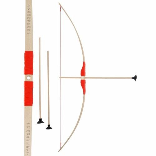 - Kinderbogen mit Loch und Lasergravur 80 cm aus Buchenholz mit roter Kunstlederwickelung, inklusive 3 speziell angepasster Holzpfeile (ohne Federn)