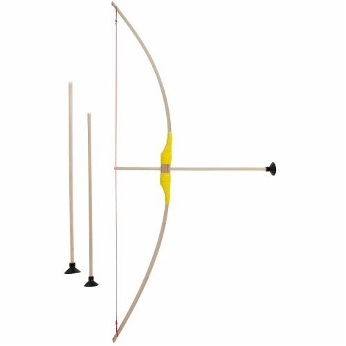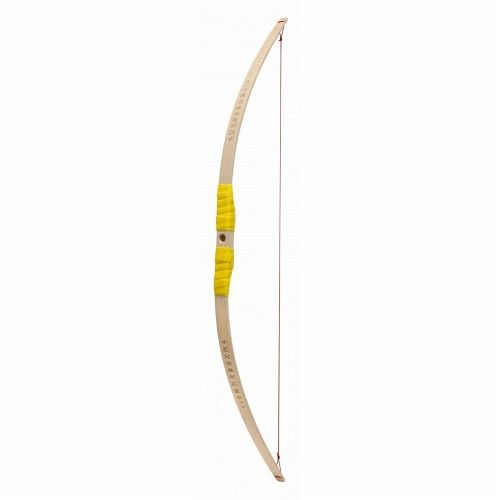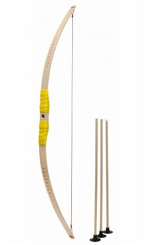 - Kinderbogen mit Loch und Lasergravur 80 cm aus Buchenholz mit gelber Kunstlederwickelung, inklusive 3 speziell angepasster Holzpfeile (ohne Federn)