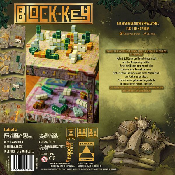Thematisch gilt es die Geheimnisse des Tempels zu entschlüsseln („Key“), indem Steinblöcke richtig arrangiert werden („Block“). Die Spieler müssen hierzu Blocksteine aus dem Vorrat wählen – sie starten anfänglich mit zufälligen Steinen – und sie hoffentlich passend oder zumindest vorausschauend auf dem Tempel(dach) verbauen. Anhand von Aufgabenkarten ersehen sie, wie sie die Steine arrangieren müssen, um zu punkten. Der Haken bzw. die taktische Herausforderung dabei ist, dass der Tempel insgesamt so ausgerichtet ist, dass jeder Spieler genau eine plane Ansicht von vorne darauf hat, also einen 2D-Blick. Es wird nicht schräg oder von oben geschaut werden. Die Abbildung auf den Karten darf zwar gedreht, aber beim Nachbauen nicht gespiegelt werden! Ein gewisser 3D-Effekt verbleibt dennoch, da in die Tiefe gebaut und geschaut werden kann. So ist es z.B. bei der Forderung von drei weißen Steinen in L-Form (von vorne betrachtet) ausreichend, wenn zwei davon nebeneinander existieren, aufgrund eines Steins, und der dritte Part des „L“’s von einem anderen Stein ersichtlich ist, der aber eine Reihe weiter hinten liegt.