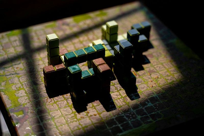 In seinem Zug wählt der aktive Spieler, ob er einen Stein oben verbauen will oder von unten Nachschub nimmt. In letzterem Fall müssen aus dem 3×3-Raster immer alle Steine einer Reihe oder Spalte genommen werden – und anschließend aufgefüllt werden. Kann er einen Stein einsetzen tut er dies stattdessen und hofft auf die Erfüllung einer Aufgabe später…oder, wenn es direkt gelingt eine der eigenen Aufgabenkarten (in drei Schwierigkeitsgraden verfügbar (leichte nur zu Beginn, zum Nachziehen dann mittelschwere und schwere)) zu erfüllen, wird dies kundgetan und eventuell, je nach Vertrauensbonus^^, allen gezeigt, indem diese zur perspektivischen Ansicht herumgebeten werden.