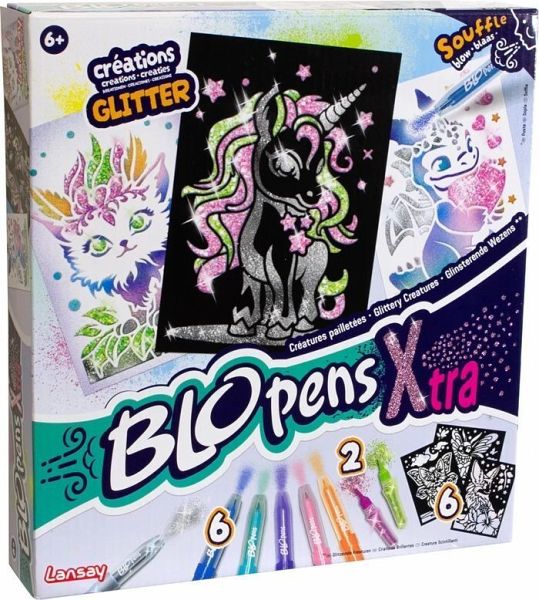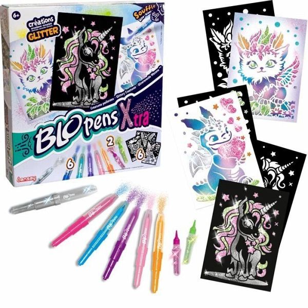 Mit den fantastischen Filzstiften ist die Gestaltung von Bildern mit Airbrush Effekt ein Kinderspiel. Einfach eine der 6 Fantasietier-Schablonen auswählen, in den Stift pusten und so ein glitzerndes Kunstwerk entstehen lassen. Zusätzlich können die Stifte auch als normale Marker verwendet werden. Die Schablonen sind wiederverwendbar und die Verschlusskappen abwaschbar.