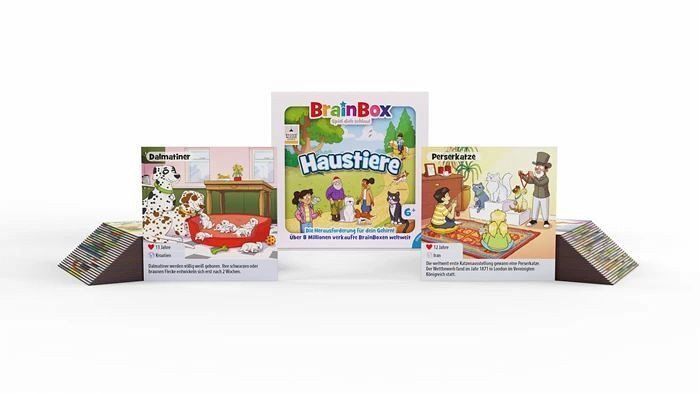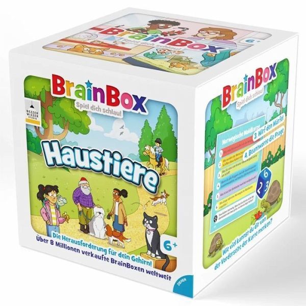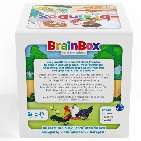 Jung und Alt meistern mit dieser BrainBox spielerisch jede Menge neue Herausforderungen. Gedächtnis, Beobachtungsgabe, Speed trainieren und Spaß haben: das ist BrainBox. In der Ausgabe Haustiere werden sowohl kleine wie große Tiere, die unser Leben bereichern thematisiert. Auf 55 der Karten sorgen 330 Fragen für Gesprächsanregungen und Abwechslung. Zusammen spielen und Spaß haben! Spiel dich schlau mit der BrainBox Haustiere.