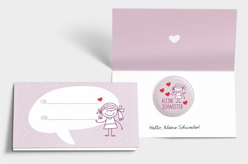 Dieser "Kleine Schwester"-Button ist das perfekte Mitbringsel-Geschenk oder eine nette Kleinigkeit zum Geburtstag. Als Motiv ist ein witziges Comic-Mädchen mit Herzen abgebildet. Der Button mit Nadelverschluss hat übrigens einen Durchmesser von 32mm und eine glänzende Optik. Verpackt ist der "kleine Schwester"-Button in einem niedlichen Mini-Klappkärtchen, auf dessen Vorderseite eingetragen werden kann für wen das Button ist und von wem er verschenkt wird. Durch die Karte wirkt der Button direkt wie ein vollständiges Geschenk, so dass das ganze ein "Runde Sache" ist.(Material: Weißblech, Papier, Kunststoff)