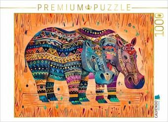 Aus dem Kalender "Abstraktes Afrika - Wilde Savanne in leuchtenden Farben" stammt dieses stilisierte Flusspferd - ruhig, kraftvoll und eingebettet in afrikanische Symbolwelten.