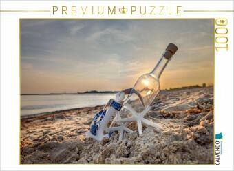 Am frühen Morgen liegt der Strand noch still und menschenleer. Die ersten Sonnenstrahlen brechen über dem Horizont hervor und tauchen Sand, Meer und Himmel in warmes Gold. Im feuchten Sand glitzert etwas im Licht - eine dekorierte Flasche, halb vom Treibgut umgeben, als hätte das Meer sie mit Bedacht an Land gespült.