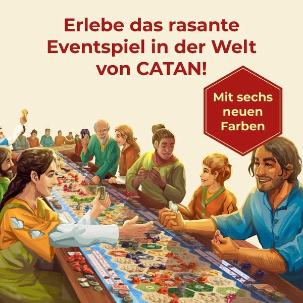 Rasantes CATAN-Erlebnis voller Action und Spaß - mit neuem, besonderem Spielgefühl in der Welt von CATAN. Alle spielen zur gleichen Zeit. Für ein besonders schnelles und dynamisches Spielerlebnis. Mit einem Connect-Spiel spielen 4 bis 6 Personen gleichzeitig auf der großen Inselwelt von CATAN. Mehrere Connect-Spiele können für beliebig große Spielrunden kombiniert werden. Gemeinsame Würfelphasen und simultanes Handeln sorgen für schnellen Spielfluss und intensive Interaktion. Inklusive App-Unterstützung für Timer, Würfel und reibungslosen Spielablauf. Einfach das Video-Tutorial zum Spielablauf im CATAN-Assistenten anschauen. Gemeinsam auf einer großen Inselwelt parallel spielen. Bis zu sechs Spielerinnen und Spieler starten Runde für Runde gleichzeitig ins Spiel! Sie erkunden die Insel und sichern sich die besten Bauplätze in benachbarten Gebieten. Der digitale CATAN Assistent führt mit Würfeln und Timer durch das Spiel. Er zeigt zudem an, ob die Sonnen- oder die Mondseite mit bauen an der Reihe ist und bringt den Räuber mit ins Spiel. Mit weiteren Sets ist es möglich, die Spieleranzahl beliebig zu erweitern. Das Event-Spiel zum beliebten Brettspiel-Klassiker mit umfangreichem Spielmaterial für große dynamische Spielrunden oder Spiele-Wochenenden mit einem besonders rasanten Spielgefühl.