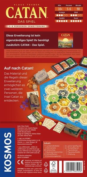 Catan wächst! Mit weiteren Landschaftsfeldern und zusätzlichen Figuren vermehren die bis zu sechs Spielerinnen und Spieler den Wohlstand Catans. Im Wettstreit miteinander bauen sie Straßen, Siedlungen und Städte, weiten Handelswege aus und setzen ihre Rohstoffe strategisch ein. Das größere Spielfeld und weitere Handelspartner bringen zusätzliche Möglichkeiten im aufregenden Spielverlauf. Die Erweiterung ist nur mit CATAN – Das Spiel spielbar. Gleich starten und Abenteuer auf Catan erleben: Die Erweiterung zum preisgekrönten Klassiker. Für fünf bis sechs Spielerinnen und Spieler ab 10 Jahren.