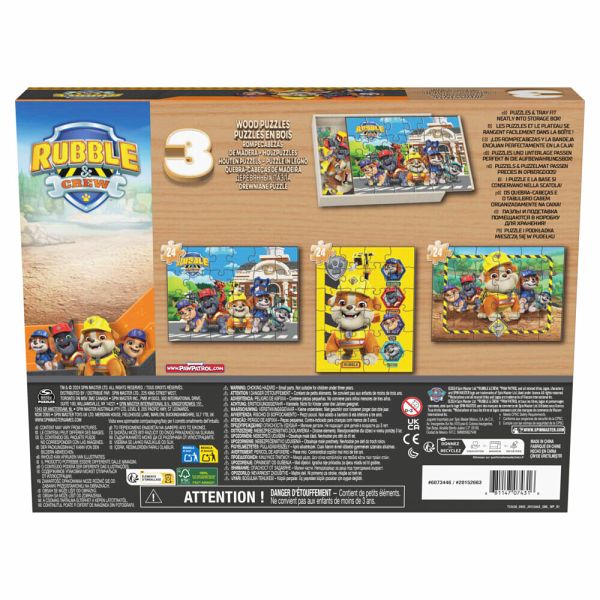 CGI Rubble & Crew Holzpuzzle 3 Holzpuzzle in einer stabilen Holzbox: Diese Puzzle-Sammlung mit 3 pfoten-tastischen Motiven ist genau das Richtige für alle Kinder, die nicht genug von Rubble & Crew bekommen können. Die drei 24-teiligen hochwertigen Holz-Puzzles können in der stabilen Holzbox mit 3 Fächern gut verstaut und transportiert werden. Die Puzzles mit verschiedenen Motiven haben eine Größe von 28,4cm x 21,3cm und sind FSC-zertifiziert. Die Rubble & Crew Holzpuzzle-Sammlung garantiert Puzzle-Spaß für alle kleinen und großen Fans von Rubble & Crew ab 3 Jahren. Inhalt: _ 3 Holzpuzzle (insgesamt 72 Puzzleteile) _ 1 Holzbox Maße: 29,84 x 4,45 x 23,19 cm