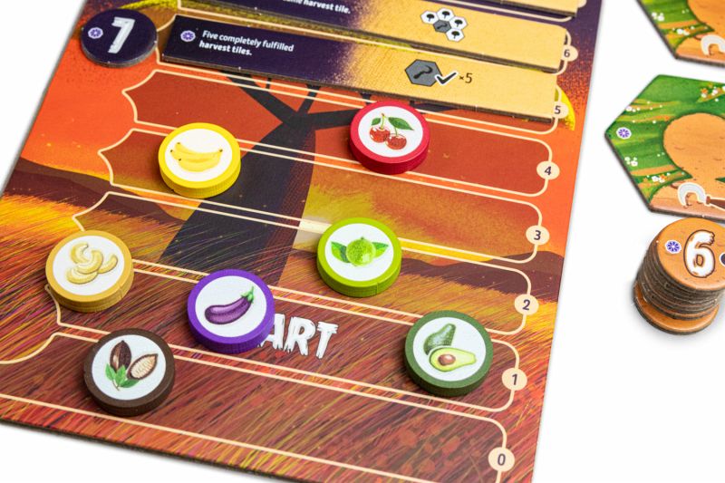 Baut eure Landschaft auf und erntet Früchte. Aber passt auf, dass ihr die Bäume im richtigen Muster pflanzt, um euer Player Board freizuspielen. Sonst könnt ihr die Ernte nicht einbringen.