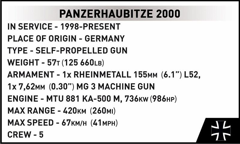 Die Panzerhaubitze 2000 ist eines der fortschrittlichsten Artilleriesysteme der Welt. Dank seiner Technologie, Reichweite und Präzision spielt das PzH 2000 eine Schlüsselrolle im modernen Kampfeinsatz und leistet effektive Feuerunterstützung. Es ist ein Symbol moderner Artillerie und Beweis für die Spitzentechnologie der deutschen Rüstungsindustrie. Wir sind stolz, diese legendäre selbstfahrende Haubitze präsentieren zu können, die in Zusammenarbeit mit dem Deutschen Panzermuseum in Münster herausgebracht wurde.Das aus über tausend Elementen bestehende Modell weist alle Merkmale seines Originals auf. Funktionierende Kettentraktion, ein drehbarer Turm und ein beweglicher Lauf einer leistungsstarken 155-mm-Haubitze sind nur einige der vielen Vorteile dieses Fahrzeugs. Das Set verfügt außerdem über eine nachgebildete Tarnung und alle mit Aufdrucken nachgebildeten Markierungen und Konstruktionsdetails, wie z. B. Kennzeichen und Lüftungsgitter. Der blockförmige PzH 2000 verfügt außerdem über zu öffnende Luken und einen beweglichen Rahmen zur Stabilisierung des riesigen Laufs. Sein Turm verfügt über ein integriertes MG3-Maschinengewehr. Die Panzerhaubitze 2000 ist sicherlich ein Modell, das in der Sammlung jedes Fans der Bundeswehr und Liebhaber moderner Rüstung und Militärtechnologie nicht fehlen darf.