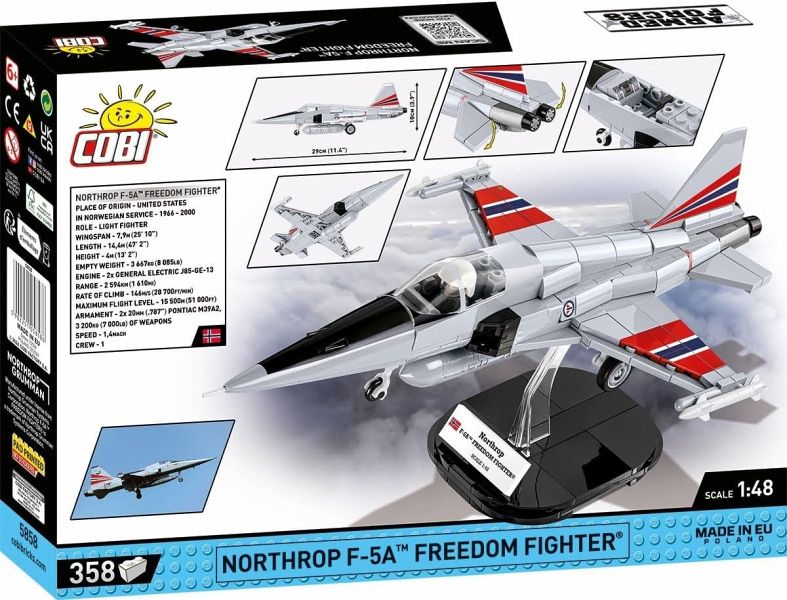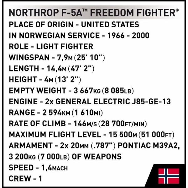 Der Northrop F-5A Freedom Fighter ist ein leichtes Kampfflugzeug, das in den 1960er Jahren von der amerikanischen Firma Northrop Corporation entwickelt wurde. Es wurde 1964 in Dienst gestellt. Der F-5A war ein beliebtes Exportmodell und erlangte weltweite Anerkennung. Seine Hauptmerkmale sind Manövrierfähigkeit, einfache Bedienung und ein relativ niedriger Betriebspreis. Dieses Flugzeug spielte in vielen bewaffneten Konflikten eine wichtige Rolle und diente als Plattform für die Ausbildung von Piloten. Zwischen 1966 und 1972 kaufte Norwegen insgesamt 108 F-5-Flugzeuge in verschiedenen Ausführungen. Diese Flugzeuge waren fast 35 Jahre lang bei der Luftwaffe im Einsatz und wurden im Laufe der Zeit zahlreichen Modernisierungsprogrammen unterzogen. Das Geschwader 336 auf dem Luftwaffenstützpunkt Rygge war die letzte Einheit, die die F-5 einsetzte, und die Flugzeuge wurden im Jahr 2000 aus dem aktiven Dienst genommen.