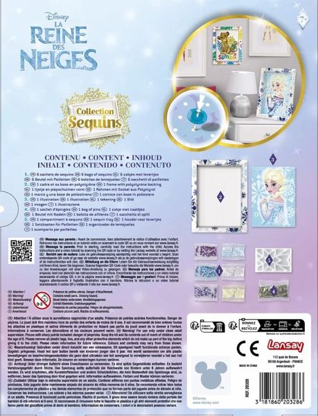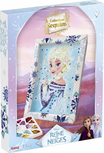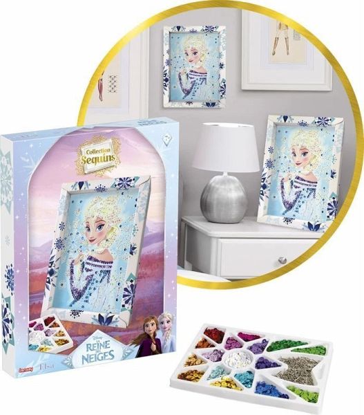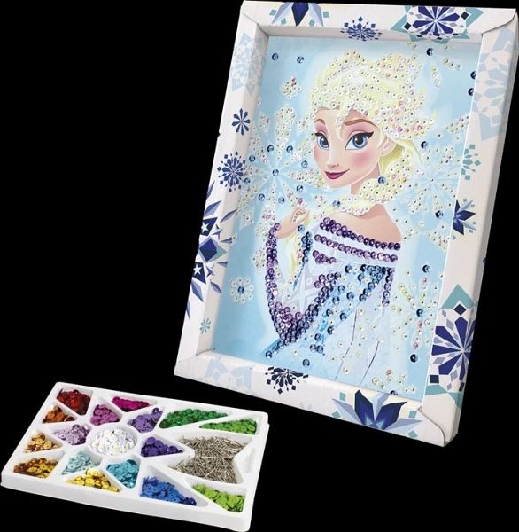 Mit glitzernden Pailletten ein schönes Bild kreieren. Die Abbildung der beliebten Disneyprinzessin Elsa liegt auf einer Styroporplatte, die als Basis für die Befestigung dient. Der Setzkasten dient als Ablage für die verschiedenen Pailleten inkl. kleine Nadeln. Dank dem Rahmen lässt sich das fertige Bild problemlos aufstellen oder einfach an die Wand hängen.