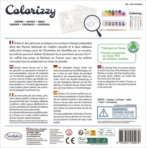 Mit Leichtigkeit können Kinder ihre ersten Kunstwerke auf zwei Bildvorlagen malen, in dem sie nach Zahlen die jeweiligen Bereiche in der entsprechenden Farbe ausmalen. Durch die 100% recycelte Verpackung der Farben, so wie das ökologische Material und die Herstellung in Frankreich können Kinder kreativ sein und gleichzeitig die Umwelt schützen.