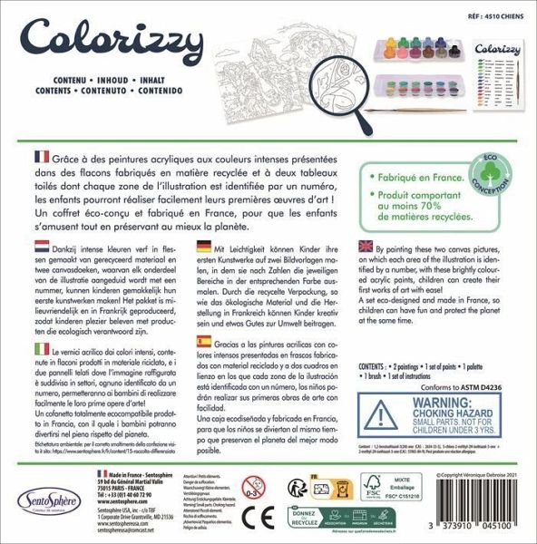Mit Leichtigkeit können Kinder ihre ersten Kunstwerke auf zwei Bildvorlagen malen, in dem sie nach Zahlen die jeweiligen Bereiche in der entsprechenden Farbe ausmalen. Durch die 100% recycelte Verpackung der Farben, so wie das ökologische Material und die Herstellung in Frankreich können Kinder kreativ sein und gleichzeitig die Umwelt schützen. Bildvorlage 22 x 22 cm.